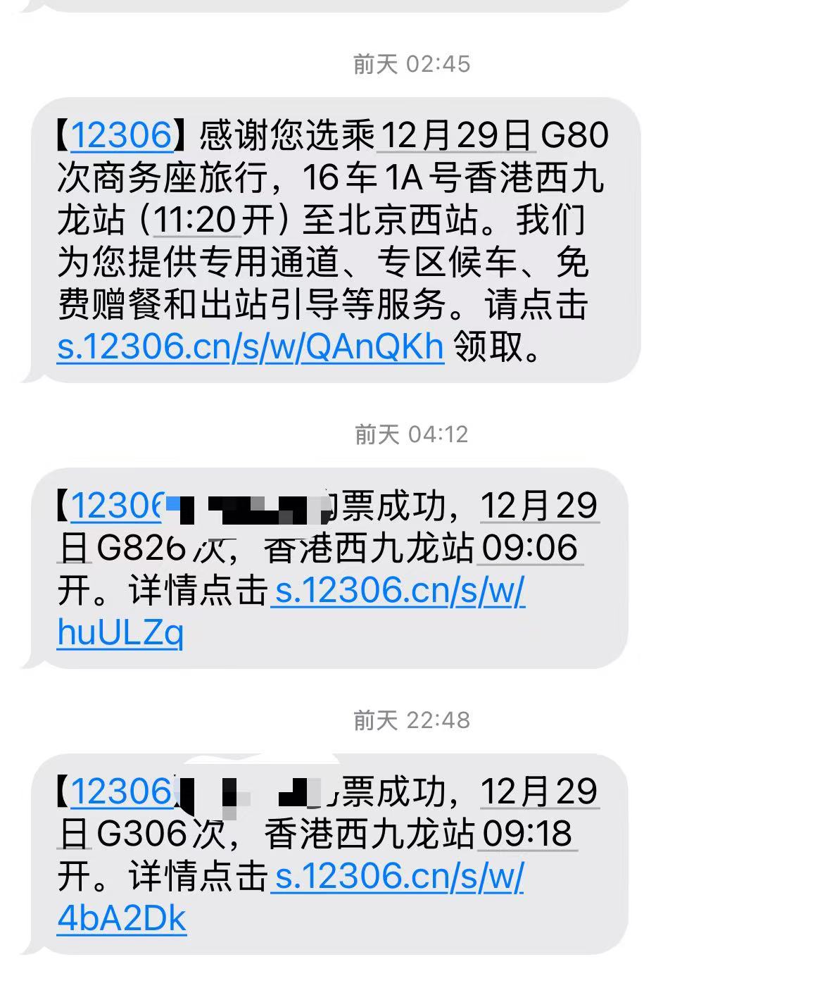 18日,杨女士向封面新闻记者,前两张高铁票的购票短信是在16日凌晨2点45分和凌晨4点12分发来的。“我早上起来上厕所,就发现了,觉得很奇怪。”杨女士登录自己的12306账号发现,一张票是G80次,12月29日上午11点20分从香港西九龙发车前往北京西的商务座票;一张票是G826次,12月29日上午9点06分从香港九龙西发车前往西安北的商务座票。“两个时间有重叠。”